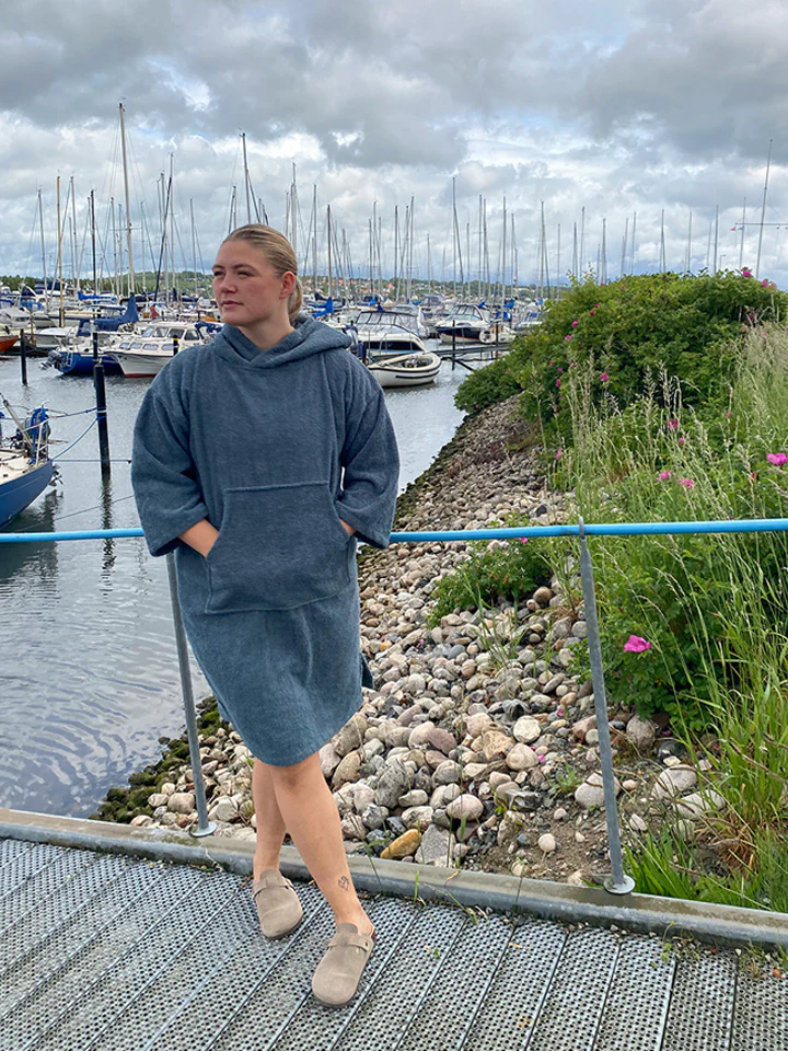Efter det friske gys i havet er der intet bedre end at trække sig ind i blød komfort. Denne håndklædeponcho fra West Coast Denmark er skabt til vinterbadere og friluftsmennesker, der sætter pris på varme, bevægelsesfrihed og et praktisk design. Den kraftige bomuldskvalitet suger effektivt vandet til sig og føles lun mod huden, mens de lange ærmer og rummelige pasform gør det let at klæde om – også udendørs.